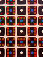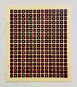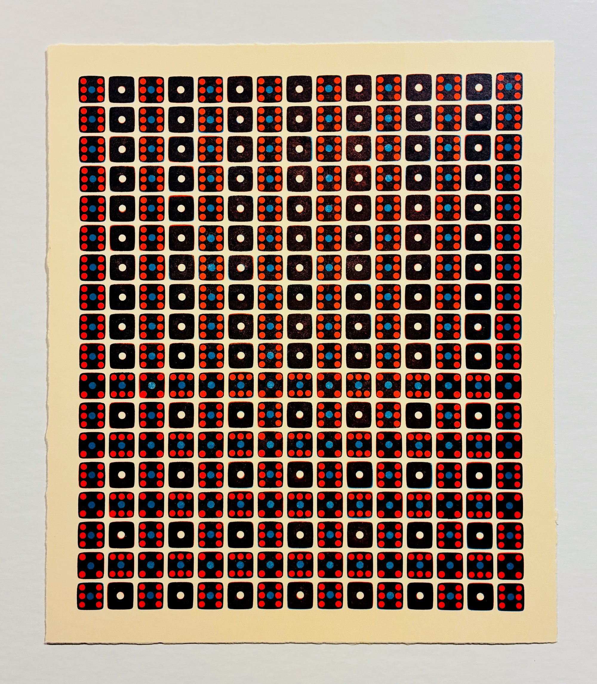 This piece was created by applying ink to the upper surface of actual dice that were carefully positioned on the bed of a Vandercook 317 letterpress. Prints of the composition are made by rolling a sheet of paper directly across the array of dice after each each fresh inking.