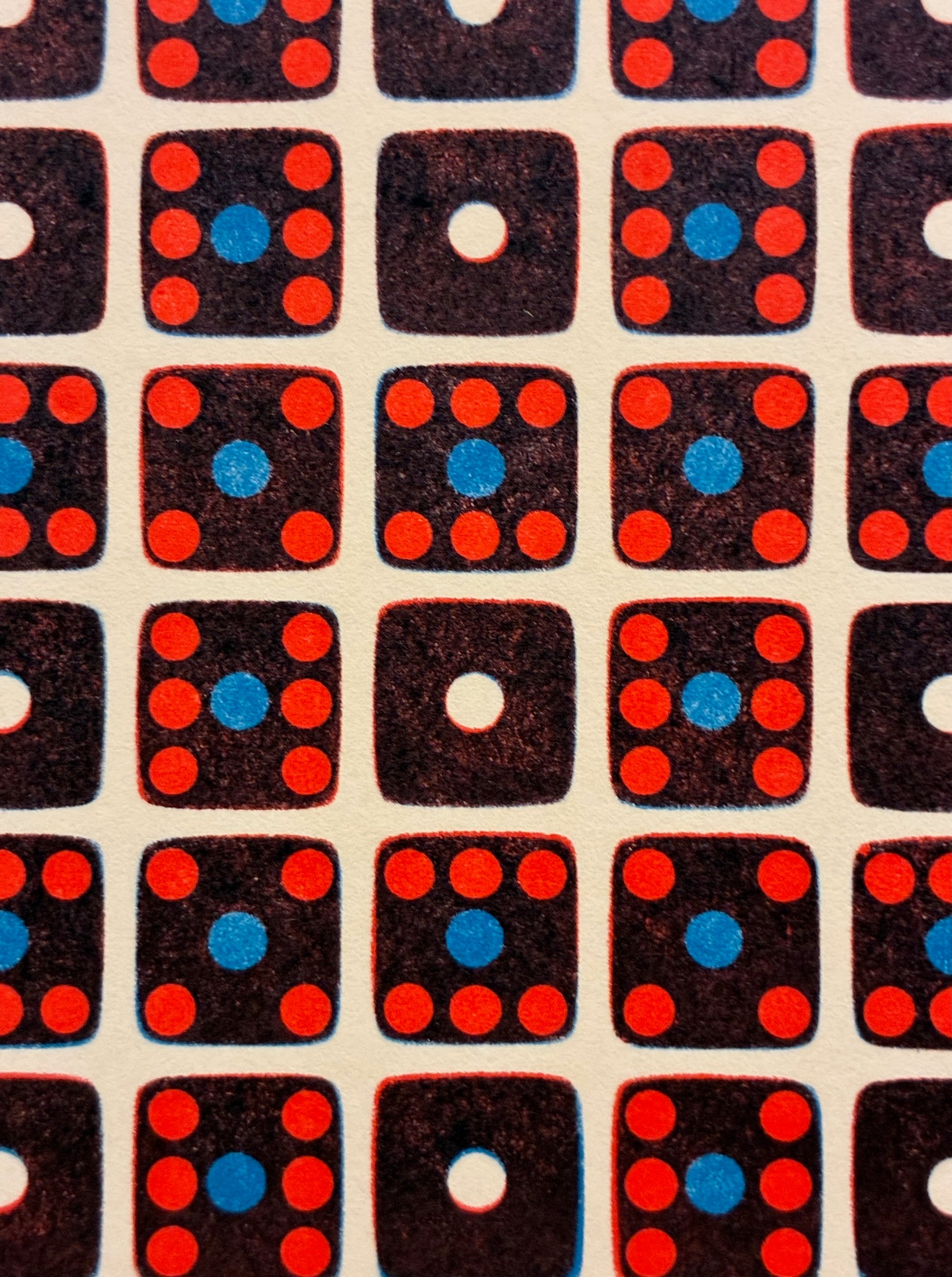 These particular prints were created by running the paper though the press twice, first with red ink and then with blue ink. By changing the arrangement of the dice between the impressions the pips in the dice will appear as either red, blue or just the color of the paper - plus there is the darker color that gets rendered where the two ink color fully overlap.
